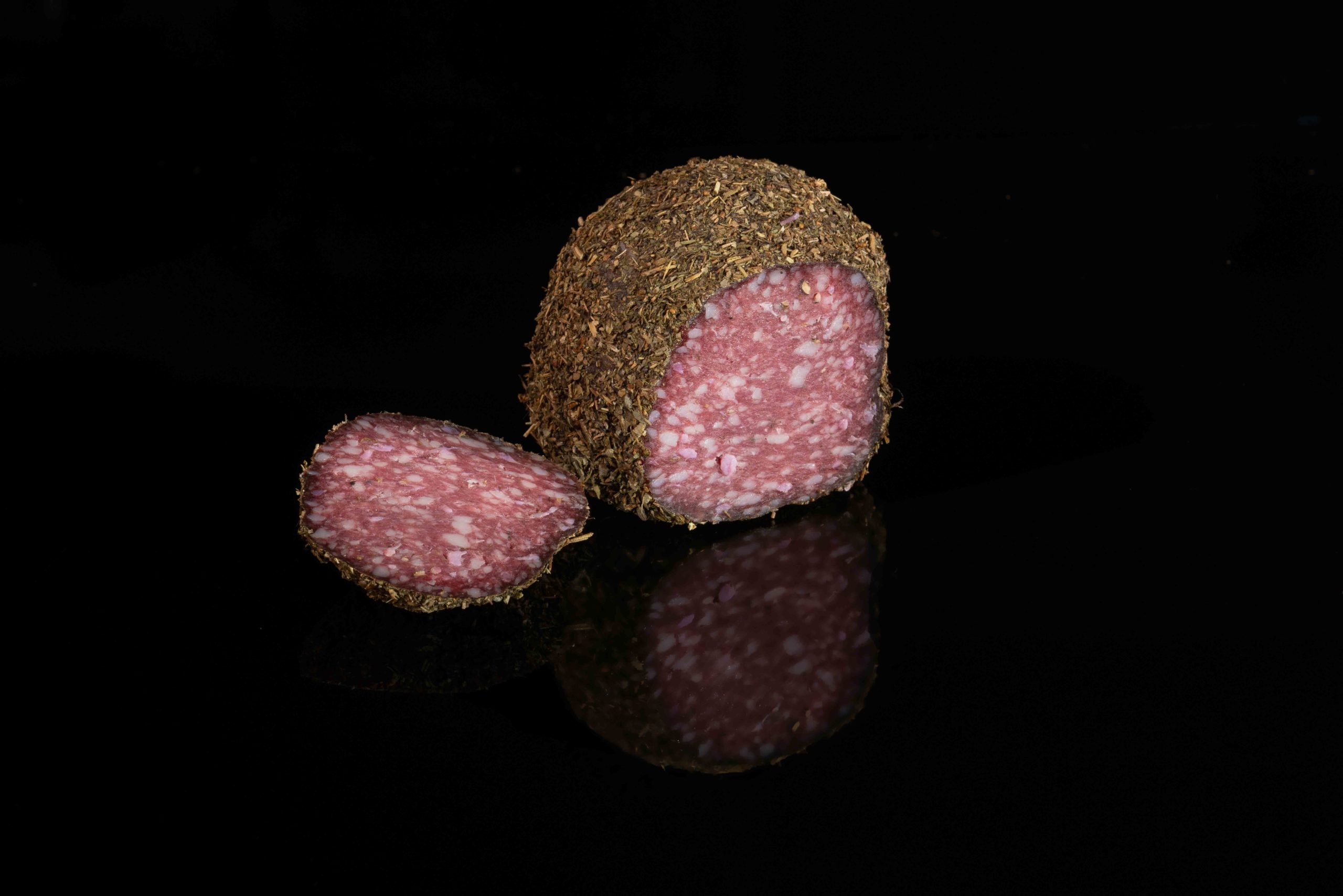 Viande de porc, de boeuf, sel, épices, vin rouge, fibre végétale, viande Suisse, produit à base de viande à consommer cru, se conserve sans réfrigération, peut subir une perte de poids.