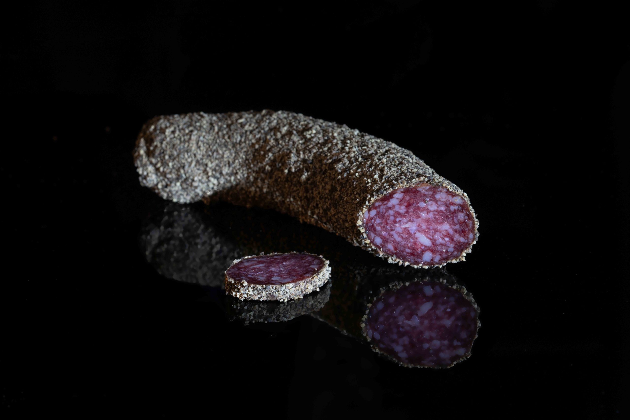 Viande de porc, de boeuf, sel, épices, vin rouge, enveloppe comestible de boeuf, viande Suisse, produit à base de viande à consommer cru, se conserve sans réfrigération, peut subir une perte de poids.