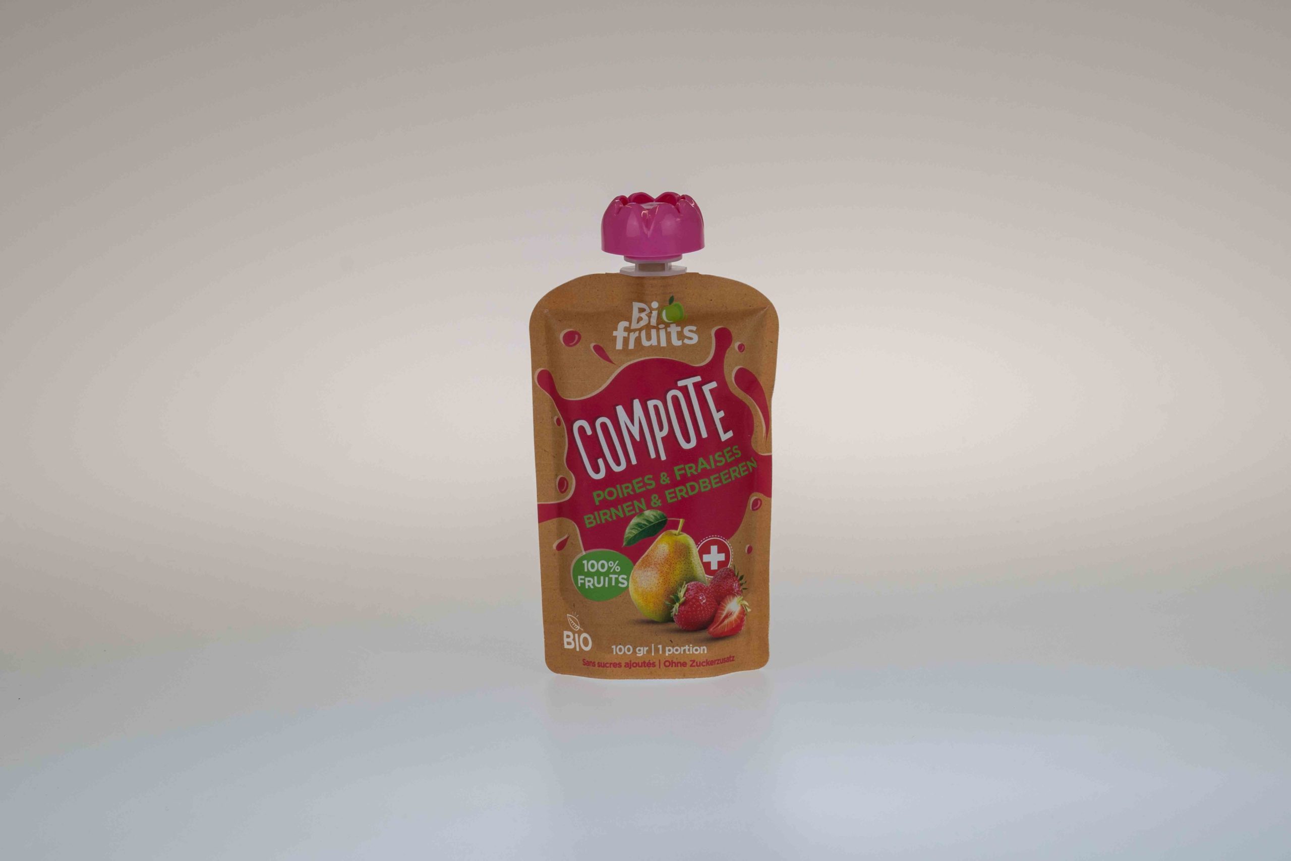 Nous avons associé de la poire valaisanne, à la rougeur d’une purée de fraises bien mûres et agréablement sucrées. Le caractéristique grain de la Williams rencontre ainsi la fraise Cléry, pour une compote originale et savoureuse,. A emporter partout ! Un concentré de saveurs dans des emballages en papier écoresponsable. Produit avec coeur en Suisse par BioFruits. Une fois ouvert conserver au réfrigérateur et consommer rapidement.