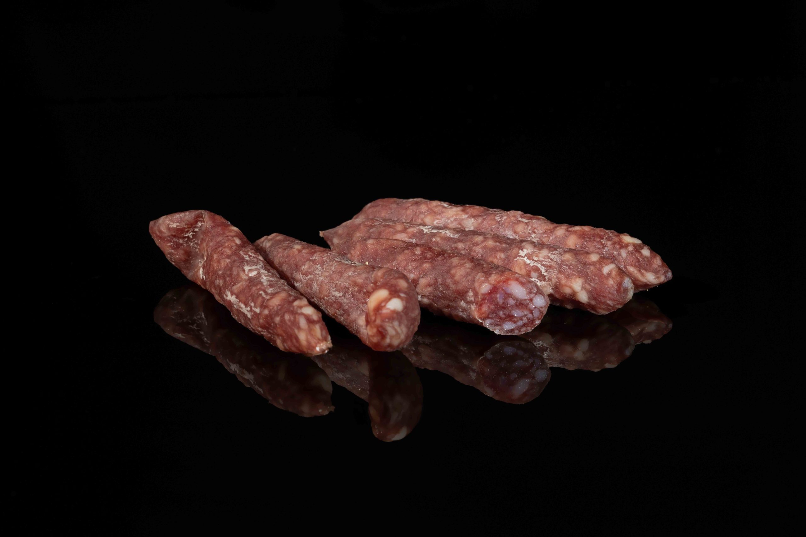 Viande de porc, de boeuf, sel, épices, Conservateur : E250, Acidifiants : E331, Antioxydants : E304, fibre végétale, enveloppe comestible, viande Suisse, produit à base de viande à consommer cru, se conserve sans réfrigération, peut subir une perte de poids