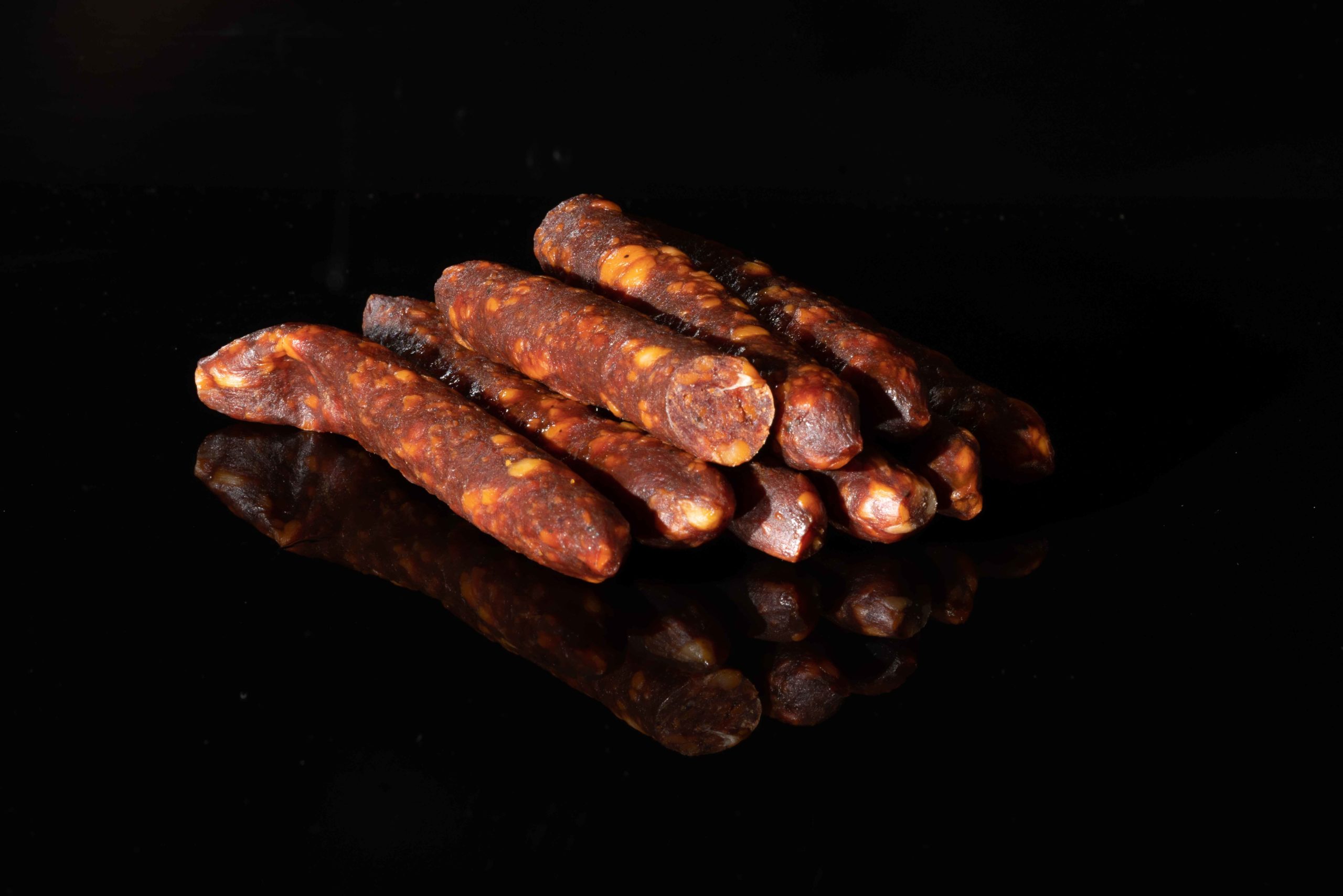 Viande de porc, de boeuf, sel, épices, Conservateur : E250, Acidifiants : E331, Antioxydants : E304, fibre végétale, enveloppe comestible, viande Suisse, produit à base de viande à consommer cru, se conserve sans réfrigération, peut subir une perte de poids