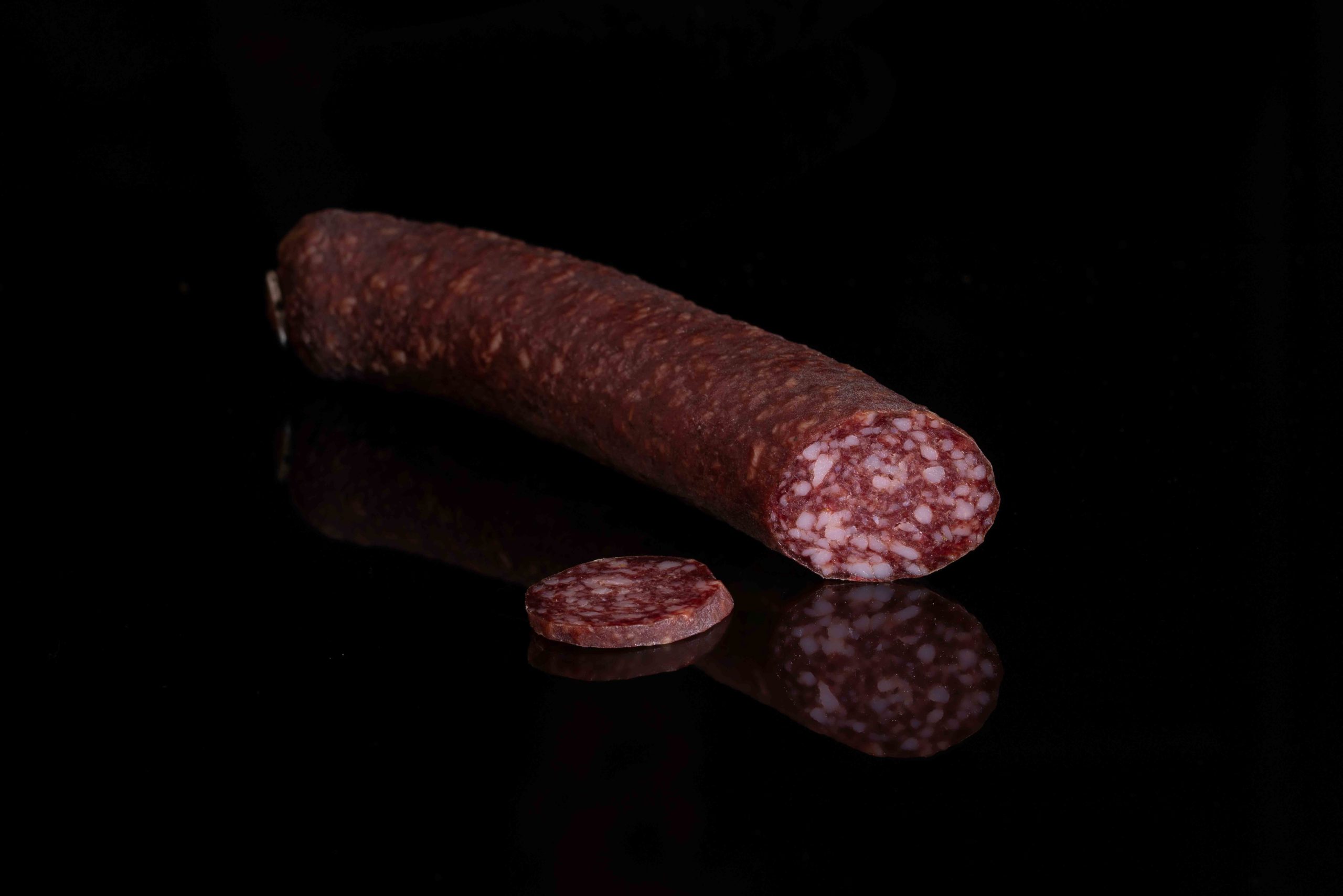 Viande de cheval 54%, de porc, sel, épices, Conservateur : E250, Acidifiants : E331, Antioxydants : E304, fibre végétale, enveloppe comestible de boeuf, provenance Europe/Suisse, produit à base de viande à consommer cru, se conserve sans réfrigération, peut subir une perte de poids.